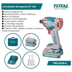 • Si necesitás potencia, rendimiento y confiabilidad en tus trabajos, el Atornillador de Impacto TOTAL TIRLI2028-4 es tu mejor elección